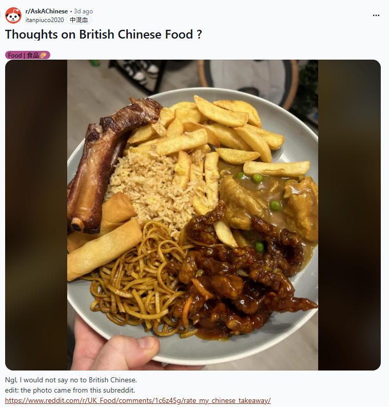 引用元: Reddit – r/AskAChinese “Thoughts on British Chinese food?” https://www.reddit.com/r/AskAChinese/comments/1pttuva/thoughts_on_british_chinese_food/